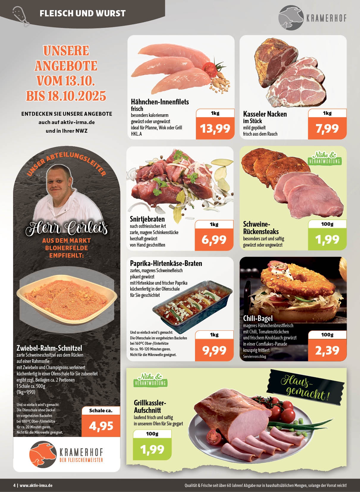 Da uns Frische, guter Geschmack und Traditionen am Herzen liegen, betreiben wir unsere Kramerhof-Frischetheken mit größter Sorgfalt und voller Leidenschaft. So können wir jederzeit sicherstellen, dass Sie stets beste Fleisch- und Wurstwaren in unseren Märkten zur Auswahl haben.
