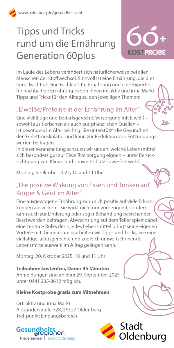 Am Montag, den 6. Oktober, und am 20. Oktober erwartet die Generation 60plus wieder eine besondere Aktion: Gemeinsam mit dem Gesundheitsamt Oldenburg, dem Ernährungsrat Oldenburg und der Gesundheitsregion Niedersachsen werden wertvolle Tipps rund um die Ernährung im Alter gegeben – alltagsnah, verständlich und mit Genuss.